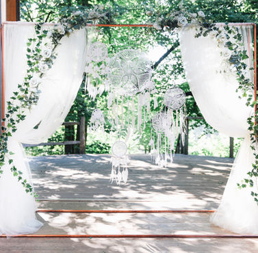 Rustic copper frame with a variety of draping looks available complimented by beautiful floral arrangements. A selection of beautiful dreamcatchers all in different sizes added to create that boho look. This frame is available in 2 sizes approximately 2.5m by 2.5m or 2.5m by 2m depending on height in your venue.